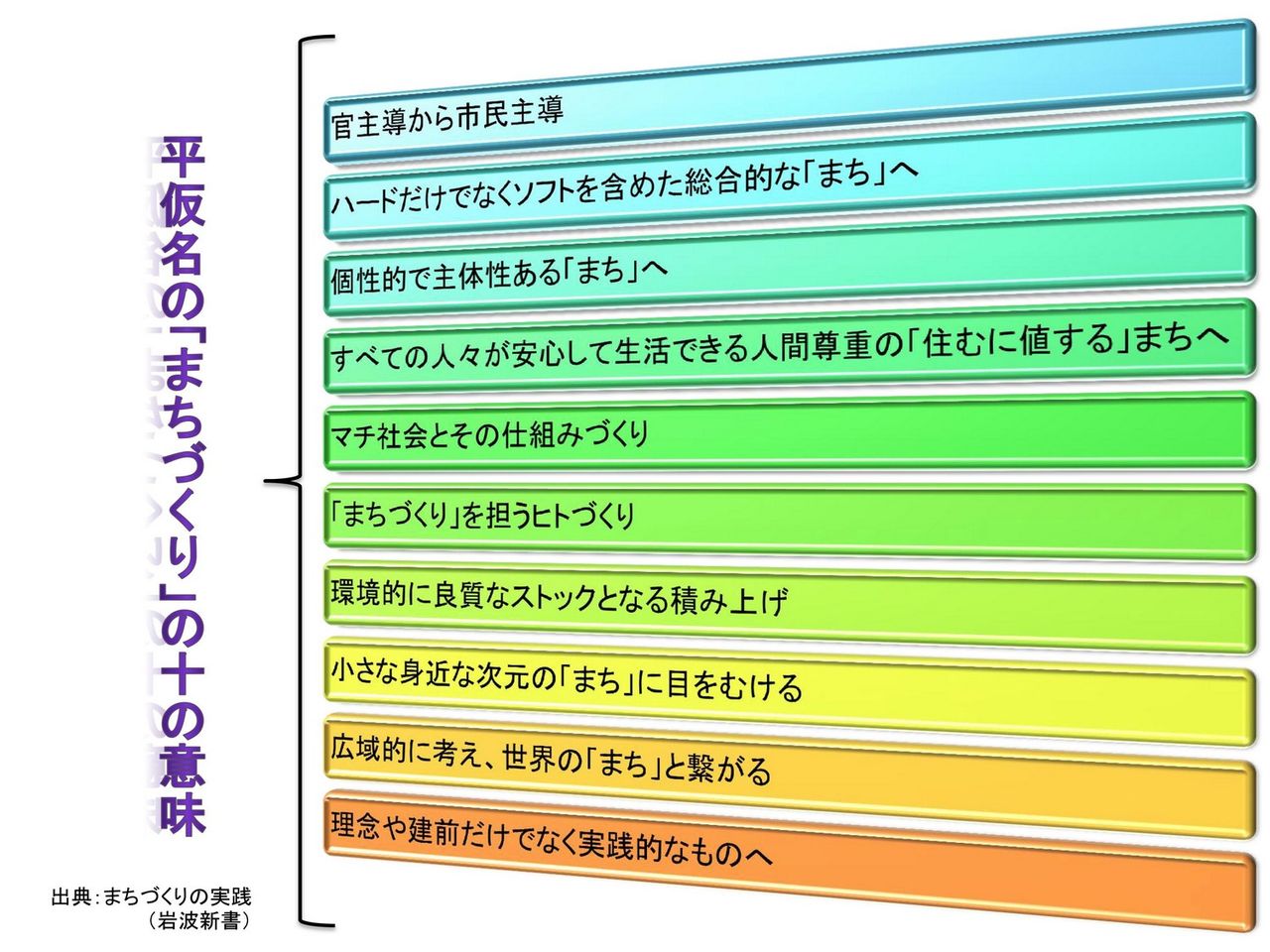 平仮名の「まちづくり」の十の意味「まち」とは、モノの面でも多様なものがあるからトータルに考えてゆかなくてはならない。さらにモノやハコをつくるだけでなく、それを決めてゆく過程や方法も考えなければならないし、「まち」をどう生き生きしたものとして使ってゆくかという方法も重要だ。ハードの「街」は、ソフトがあってこそ、初めて有効に使われる。ソフトの面には「まちづかい」という意味もあり、ハードとソフトの両面を含む総合的なものとして「まち」を整えてゆくことである。